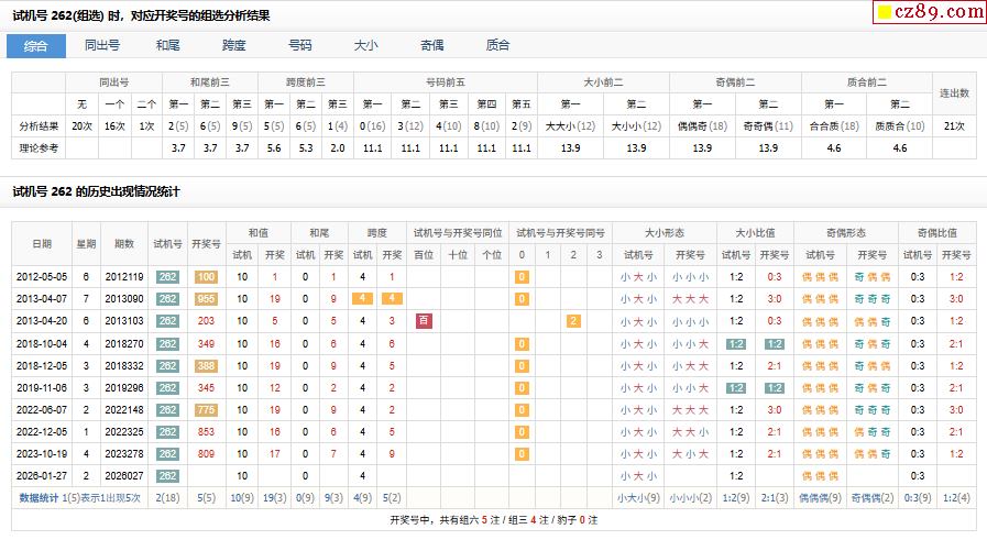 > 027期福彩3D试机号262对应开奖号的组选分析结果